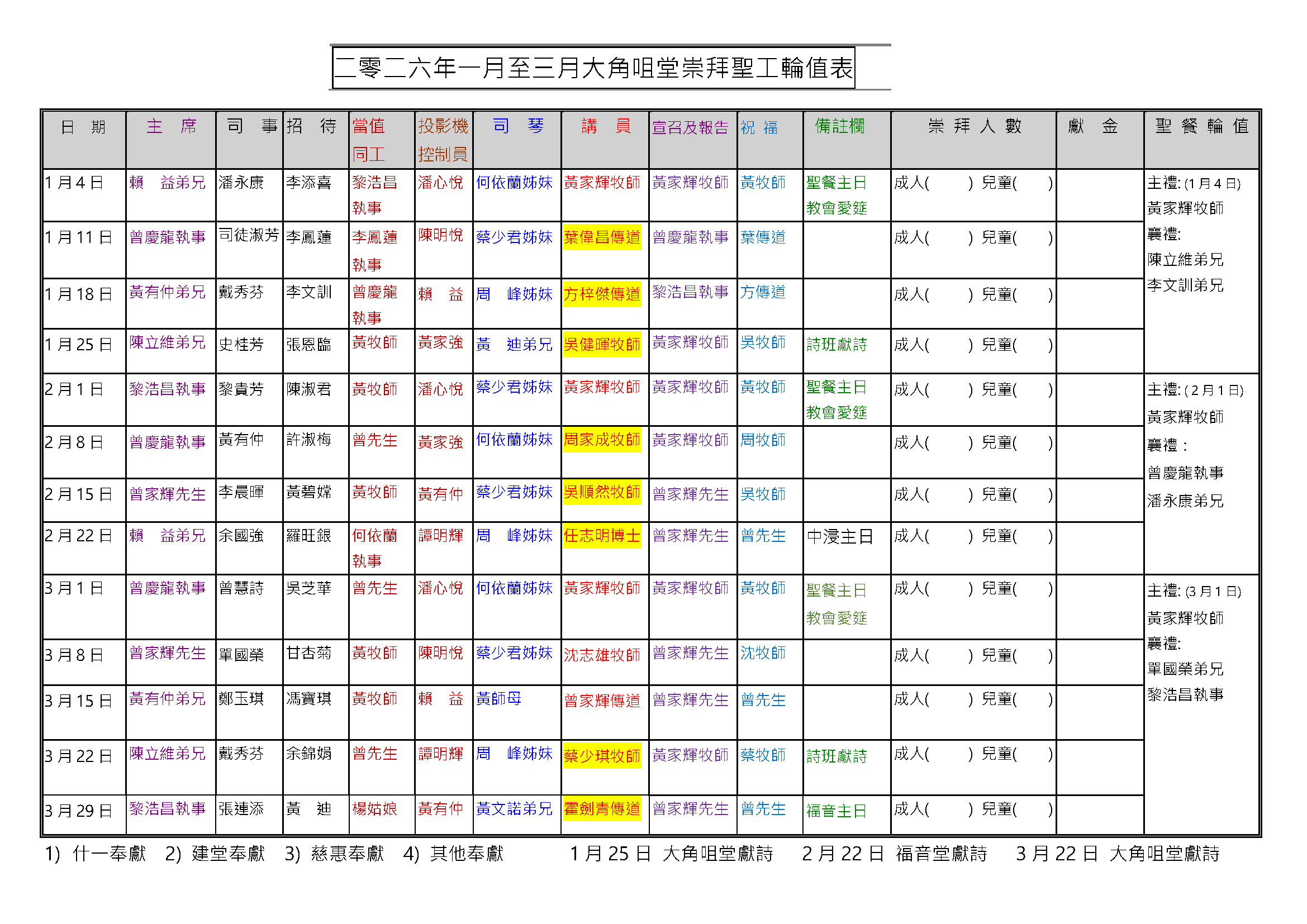 大角咀堂聚會時間表 主日崇拜:逢星期日上午十時正 聖餐聚會:每月第一個主日崇拜 兒童崇拜及主日學:逢星期日上午十時正 初中主日學:逢星期日上午十時正 高中主日學:逢星期日上午十一時四十五分 成人主日學:每月第二、四星期日上午十一時四十五分 愛筵:每月第一個主日崇拜後 *崇拜聖工輪值表